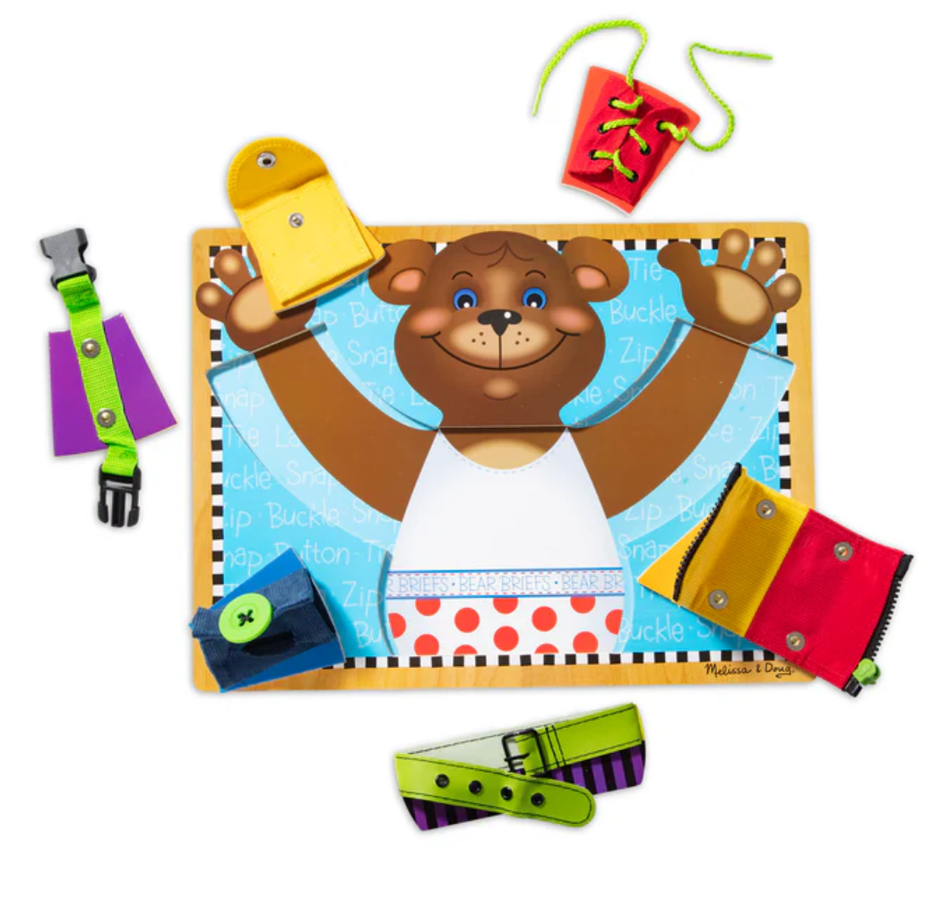 - Buckle (belt and seat belt), button, lace, snap, tie and zip your way to independent dressing skills
