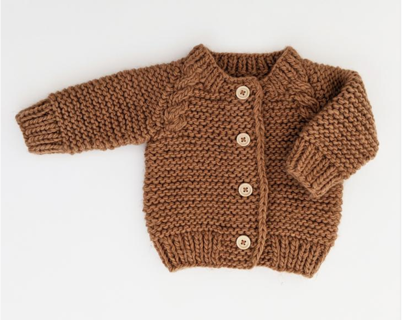 Thick, soft sweater in garter stitch has cable trim raglan sleeves and wood buttons. Hand-knit in Pecan brown yarn, it is cozy and warm. The matching knit hat you see here is available separately. What a wonderful gift for any little person you know.